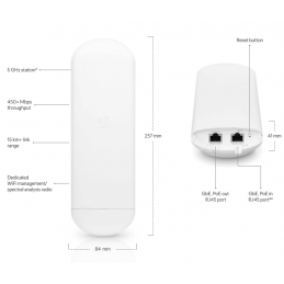 Model: NBE-2AC-13 Dimensions : 189 x 189 x 125 mm (7.4 x 7.4 x 4.9") Weight : 530 g Enclosure material: UV-stabilized plastic Mounting: Pole mount kit (Included) Wall mount: (Not included) Wind loading: 45.4 N at 200 km/h (10.2 lbf at 125 mph) Wind survivability: 200 km/h (125 mph) Networking interface: (1) GbE RJ45 port Power method: Passive PoE (Pairs...
