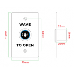 Model: Exit-NMST70-TW Power: DC12 Output Contact: NO/NC/COM Sensitive Distance: 5-20cm LED Indicator: Standby blue, Response green. Material: Stainless steel panel