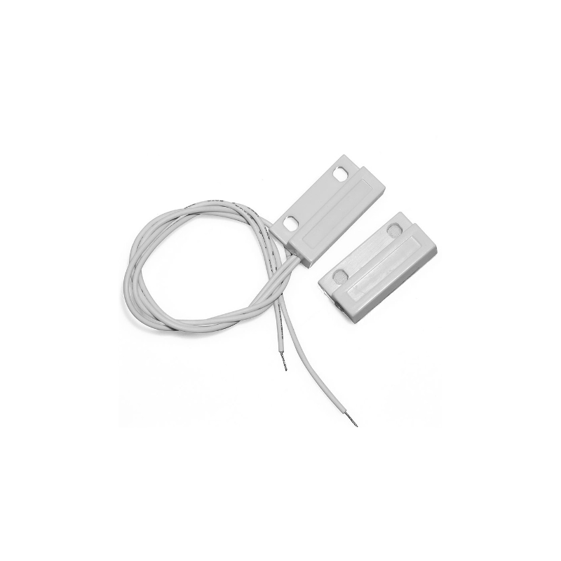 Model: SM-206Q/W Used for protecting sliding doors and windows where space is limited Contact reed switch is SPST, deactivated rhodium on gold under-plating, for a long life Unique glue/epoxy compound protects reed switch 1/4″, Press-fit mount 15″, (38cm) wire leads 1″ (25mm) Gap White case