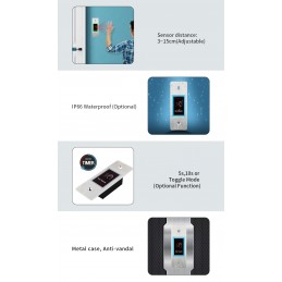 Model: KS-Ebutton 2-X Waterproof, IP66 with 5s or 10s-time delay or Toggle Mode Zinc-alloy housing 9-24V DC Output contact: NO/NC/COM Sensor Distance: 3-10 cm (Adjustable) Red LED indicator: standby Green LED indicator: active Dimensions: 115x70x25 mm