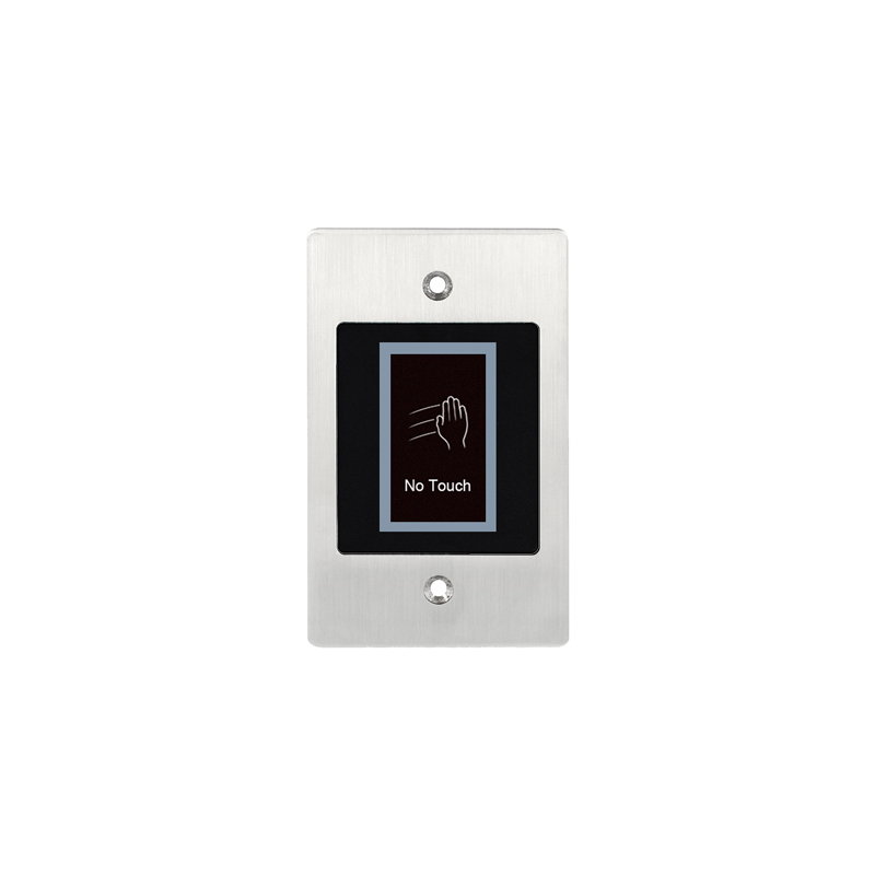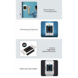 Model: Ebutton 1 No Touch Exit Button  Stainless steel plate, embedded design Output contact: NO/NC/COM Sensor distance: 3~15cm (Adjustable) Blue LED indicator: standby Red LED indicator: active Two versions for optional: Normal version: Not waterproof 5s, 10s timer delay or Toggle Mode
